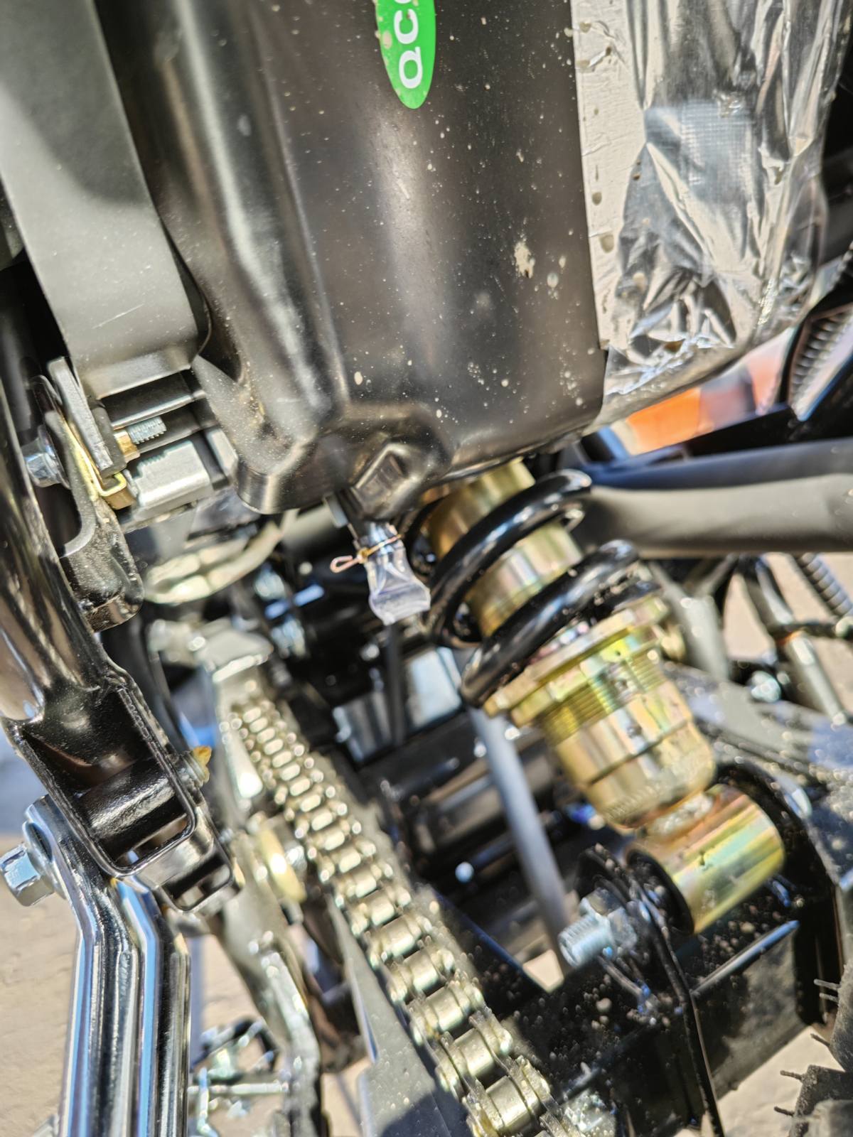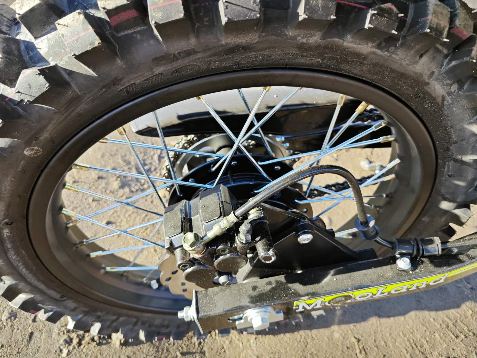 Мотоцикл имеет большие колеса с внедорожными шинами, которые обеспечивают отличное сцепление с грунтом и устойчивость на сложных участках трассы.